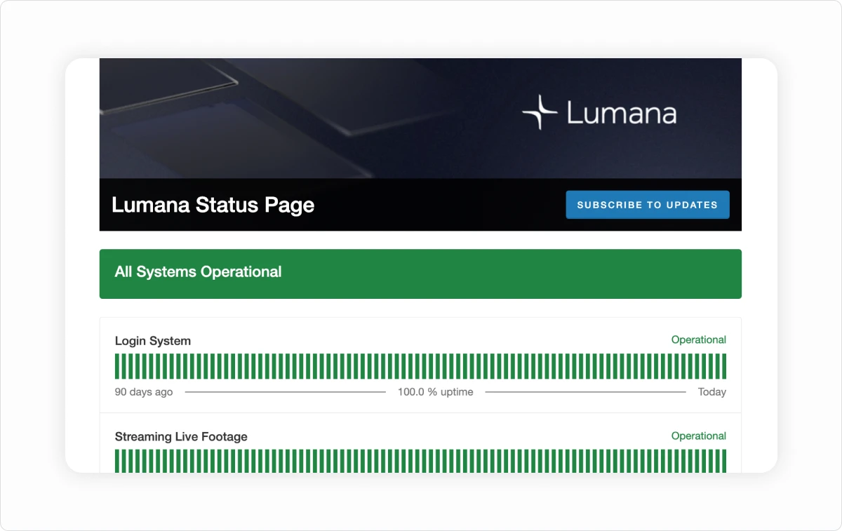 We have launched a new Lumana Status Page so your team can always see how the platform is performing. The page provides real-time system status, previous 90-day uptime, and a history of reported incidents, giving you complete visibility into Lumana’s reliability.